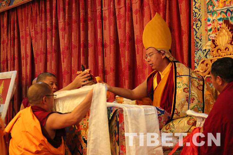 誦經(jīng)結(jié)束后,土多申格副院長帶領(lǐng)3名經(jīng)師代表和3名學(xué)員代表,向十一世班禪敬獻(xiàn)曼扎、佛像、佛塔、佛經(jīng),進(jìn)行佛事禮拜。班禪微笑接過供奉,一一為其摸頂賜福。