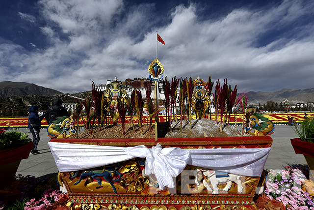 隨著工作人員按照規(guī)劃有序地將仿真花卉和絹花擺放,布達(dá)拉宮廣場(chǎng)上,藏漢雙語(yǔ)的“歡度春節(jié)藏歷新年”字樣逐漸成型。待巨大的切瑪盒擺放到位后,工作人員在切瑪盒兩側(cè)分別放入青稞和剛剛炒制出的糌粑,隨后插上綻放在新年里的“羅薩梅朵”,裝扮布達(dá)拉宮廣場(chǎng)。