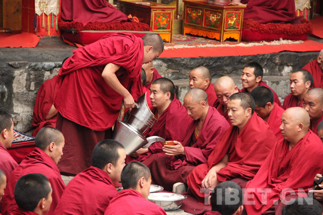 藏族社會(huì)的飲茶之風(fēng),從藏傳佛教寺院僧眾一天的生活中也能窺見一斑。通常僧人們每日集體飲三次茶,即在早、中、晚三個(gè)時(shí)間段的誦經(jīng)禮佛活動(dòng)后,由寺院統(tǒng)一熬茶分給他們喝。特別是在舉行法事活動(dòng)的時(shí)候,僧人飲茶就表現(xiàn)得更為明顯:每當(dāng)舉行法事儀式時(shí),莊重肅穆的經(jīng)堂內(nèi),僧人們誦讀經(jīng)文。待斟茶之際,眾僧從自己懷里取出隨身攜帶的茶碗放在跟前,就有專門負(fù)責(zé)司茶的年輕僧人提著茶壺給眾僧斟茶。