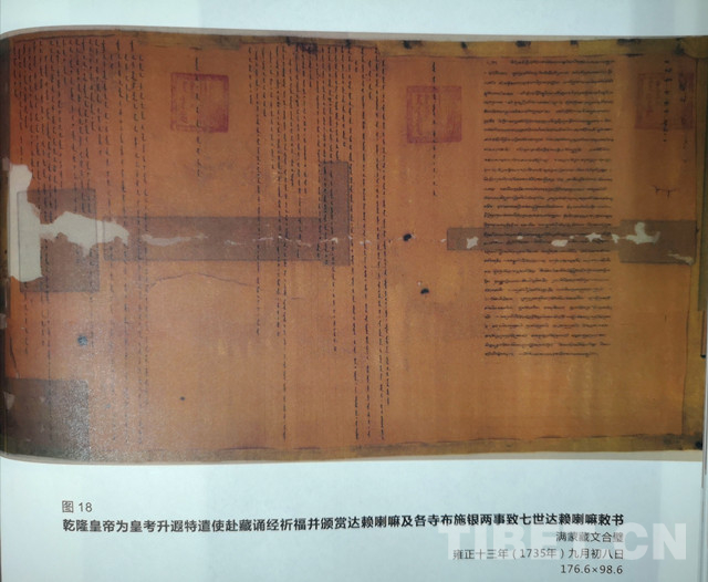 圖為《西藏自治區(qū)檔案館館藏蒙滿文檔案精選》中滿蒙藏文合璧的《乾隆皇帝為皇考升遐特遣使赴藏誦經(jīng)祈福并頒賞達(dá)賴?yán)锛案魉虏际┿y兩事致七世達(dá)賴?yán)镫窌?。攝影:李元梅