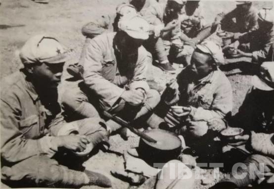 “當(dāng)時(shí)吃飯會(huì)限額,一斤16兩,每人只能吃10兩,上午10點(diǎn)鐘開飯吃5兩,下午4點(diǎn)多鐘吃5兩。這時(shí)吃的糧食是進(jìn)軍西藏時(shí)背進(jìn)來的,還有采買的青稞。”郎杰說到:“在洗臉盆里一大碗湯,或者蛋黃蠟,買點(diǎn)元根,里面倒點(diǎn)辣椒和鹽巴,一個(gè)洗臉盆所盛為10個(gè)人的飯量。唱完歌就開飯。10個(gè)人蹲著吃,都先盛完。吃飯前先唱歌,比如當(dāng)時(shí)唱的是‘解放軍的天,是明朗的天’……唱完后,連長(zhǎng)說開飯大家才可以吃?!?/p>