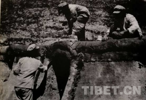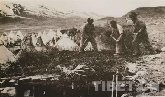 隨后,根據(jù)領(lǐng)導(dǎo)指示,各大隊(duì)沿山坡兩邊挖掘坑洞。4月的甘孜,有些凍土還沒化,必須先點(diǎn)燃草根將土層凍土融化,才比較好挖土地。接著是準(zhǔn)備修建窯洞所需的“建筑材料”,到離宿營地?cái)?shù)十里外的山林里砍樹。用這些木材鋪頂,上面鋪上帳篷布,再堆上泥土。這樣建成的窯洞,倒也冬暖夏涼。修建窯洞群的戰(zhàn)士們頗為自豪地稱其為“康藏大廈”。