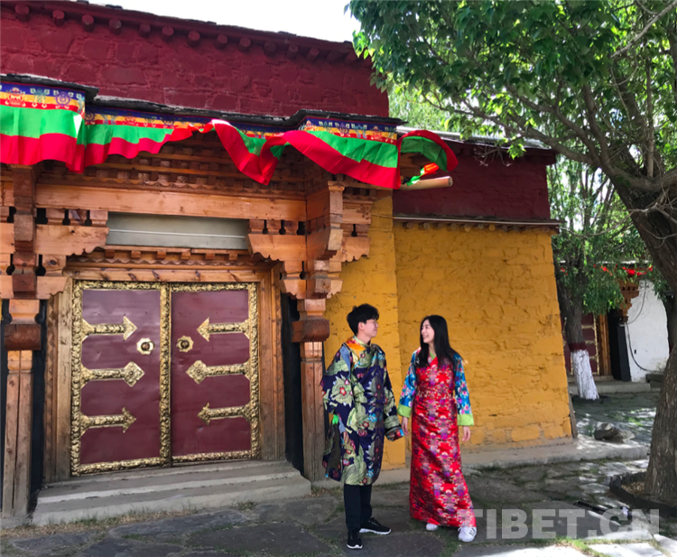 圖為正在瓊結(jié)縣藏式建筑前拍照留影的一對(duì)情侶。