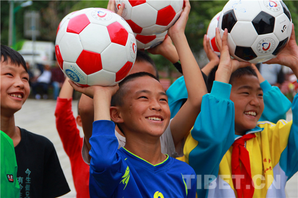 圖為香格里拉市金江鎮(zhèn)小學孩子拿到“愛心足球”