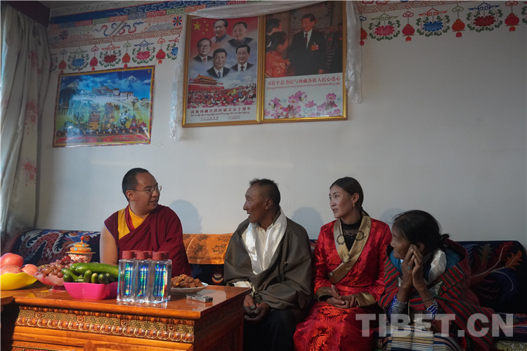 在旺堆平措家中,十一世班禪仔細(xì)詢問了他們一家人的生產(chǎn)生活狀況?!耙郧暗纳詈同F(xiàn)在的生活相比變化大嗎?”“父輩的生活怎么樣?”“你們身體怎么樣,膝蓋疼嗎?”“出去旅游嗎?”“冬天怎樣取暖?”“下雪了牲畜怎么辦?”“電視能看到多少頻道?”十一世班禪與旺堆平措一家輕松愉快地聊著家常。