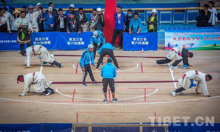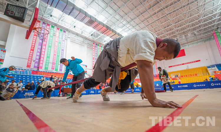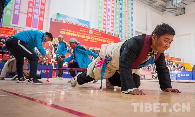 押加,藏語叫“浪波聶孜”,意為大象頸部技能。因其拔河方式需雙手雙腳附在地上用力,形似大象,故又稱“大象拔河”,是藏族人民非常喜愛的一項民族傳統(tǒng)體育運動。(中國西藏網(wǎng) 記者/趙耀 鄭朔)