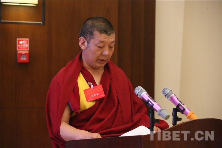 西藏自治區(qū)政協(xié)副主席、中國(guó)佛教協(xié)會(huì)西藏分會(huì)常務(wù)副會(huì)長(zhǎng)、西藏佛學(xué)院院長(zhǎng)珠康?土登克珠以“維護(hù)祖國(guó)統(tǒng)一和民族團(tuán)結(jié),堅(jiān)決反對(duì)分裂”為題,作教義闡釋演講。
