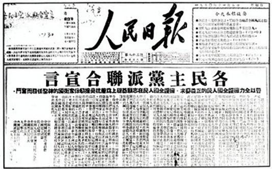 1950年11月4日,中國(guó)共產(chǎn)黨與各民主黨派發(fā)表聯(lián)合宣言:“誓以全力擁護(hù)全國(guó)人民的正義要求,擁護(hù)全國(guó)人民在志愿基礎(chǔ)上,為著抗美援朝,保家衛(wèi)國(guó)的神圣任務(wù)而奮斗?!眻D為《人民日?qǐng)?bào)》刊載的《各民主黨派聯(lián)合宣言》 圖片來源:人民網(wǎng)