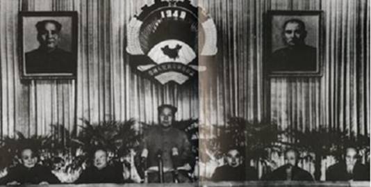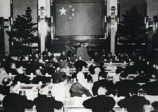 1954年12月21日,全國(guó)政協(xié)二屆一次會(huì)議在京舉行。會(huì)議修改了政協(xié)章程。圖為大會(huì)主席臺(tái)。左起:郭沫若、李濟(jì)深、毛澤東、周恩來、沈鈞儒、陳叔通 圖片來源:人民網(wǎng)