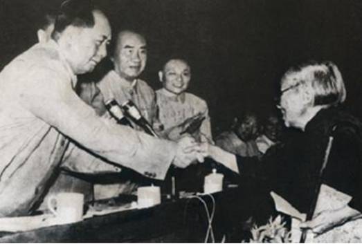 1961年7月1日,在慶祝中國(guó)共產(chǎn)黨成立40周年紀(jì)念會(huì)上,何香凝代表各民主黨派、無黨派民主人士、工商聯(lián)獻(xiàn)詞。圖為講話后,毛澤東和她握手 圖片來源:人民網(wǎng)