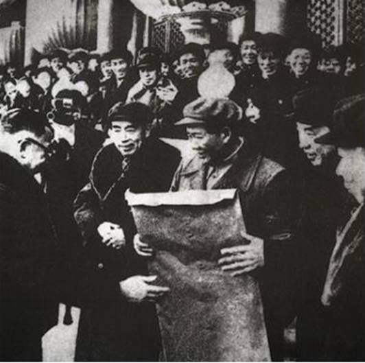 圖為1956年1月15日,北京市實(shí)現(xiàn)全行業(yè)公司合營(yíng),民建中央常委樂松生代表北京工商界在天安門城樓向毛澤東主席報(bào)喜 圖片來源:人民網(wǎng)