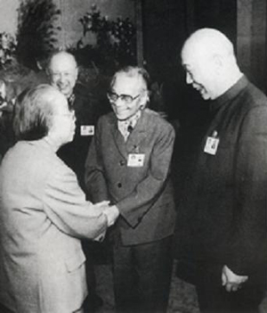 1990年2月,鄧小平、江澤民、李鵬、萬里會(huì)見香港基本法起草委員會(huì)全體委員時(shí),與參加委員會(huì)的雷潔瓊、費(fèi)孝通等握手。各民主黨派有數(shù)十位專家、學(xué)者分別參加了香港和澳門基本法起草委員會(huì),為貫徹“一國兩制”方針和香港、澳門回歸祖國做了許多工作 圖片來源:人民網(wǎng)