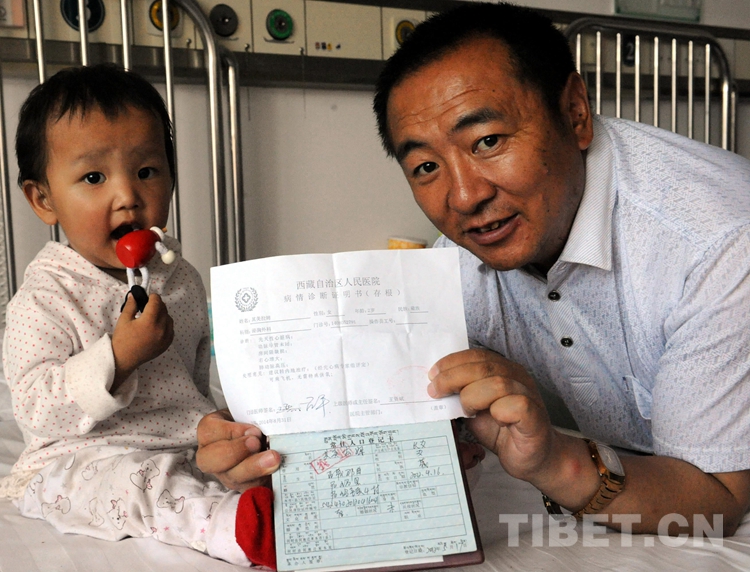 這是其美拉姆和阿爸次仁石達(dá)在北京安貞醫(yī)院小兒心臟病房。她阿爸手中展示的是她的戶口本與西藏病情診斷證明書(唐召明2014年9月9日攝)