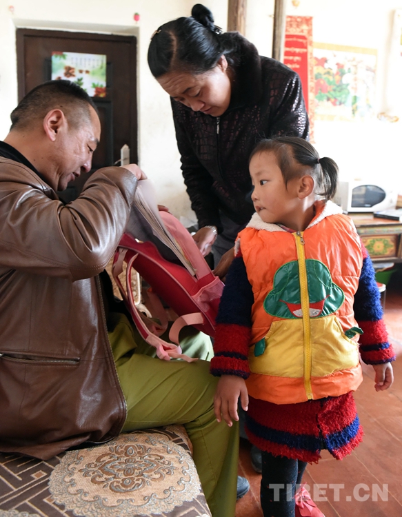 這是父母幫助術(shù)后的其美拉姆整理書包,準(zhǔn)備送她去幼兒園。(唐召明2016年10月6日攝)