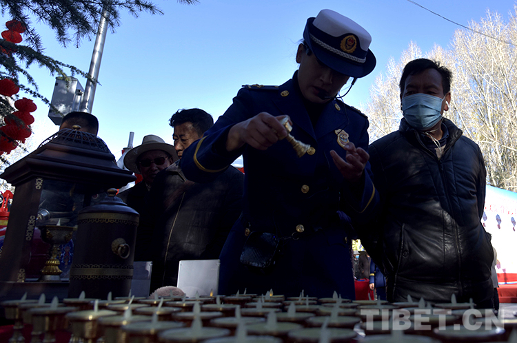圖為消防指戰(zhàn)員為市民講解冷光源酥油燈使用方法 攝影:王媛媛
