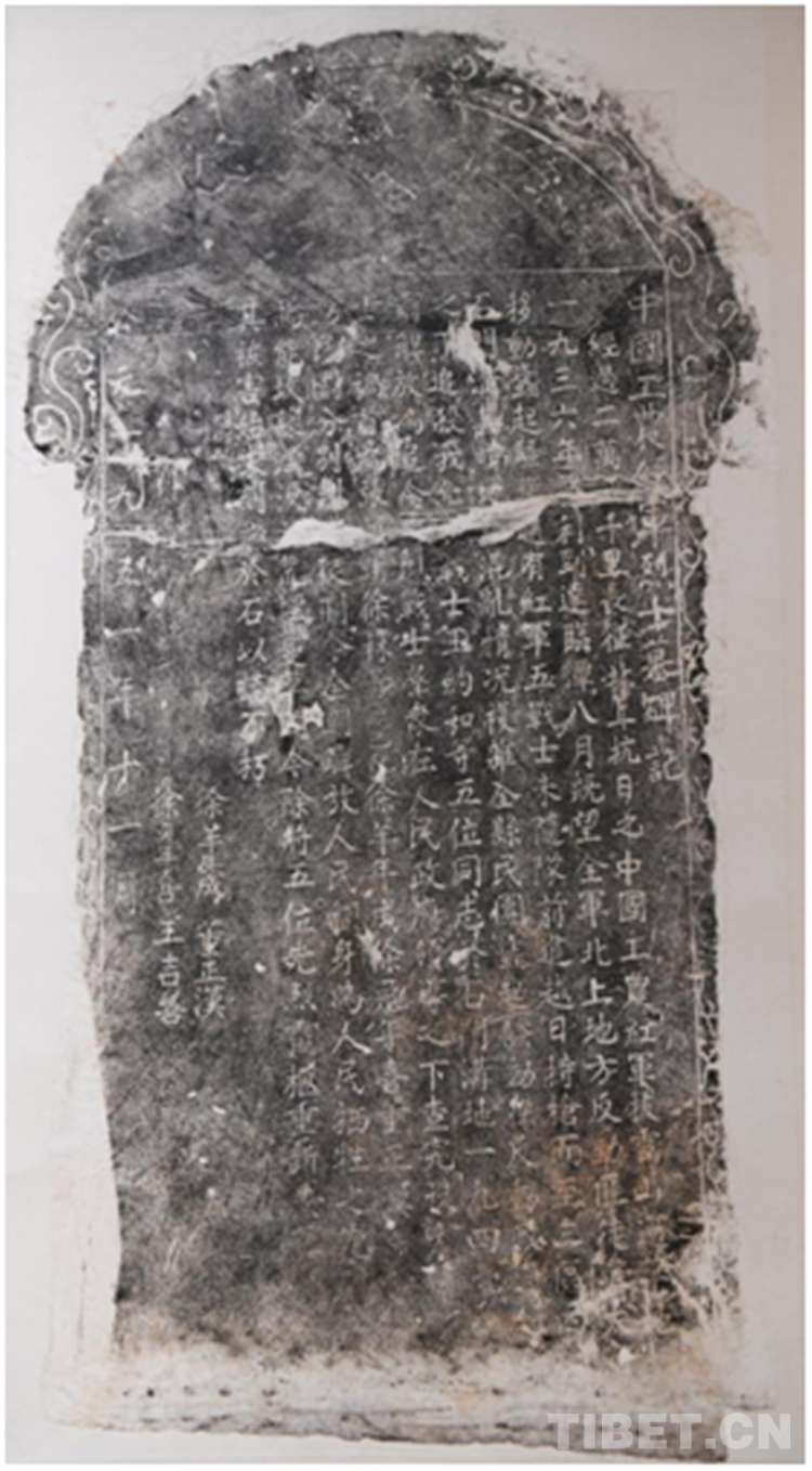 展覽中還有一幅與紅軍過雪域有關(guān)的展品——《中國工農(nóng)紅軍烈士墓碑》(1951年)拓片。碑文記錄了這樣一段歷史:1936年,中國工農(nóng)紅軍長征北上抗日到達(dá)臨潭(今甘肅省甘南藏族自治州臨潭縣)時(shí),紅軍戰(zhàn)士王約如等5位戰(zhàn)士在石門溝犧牲。1949年,這5位戰(zhàn)士被追念為先烈戰(zhàn)士,人民政府查究兇手,重新安葬了英烈戰(zhàn)士靈柩。