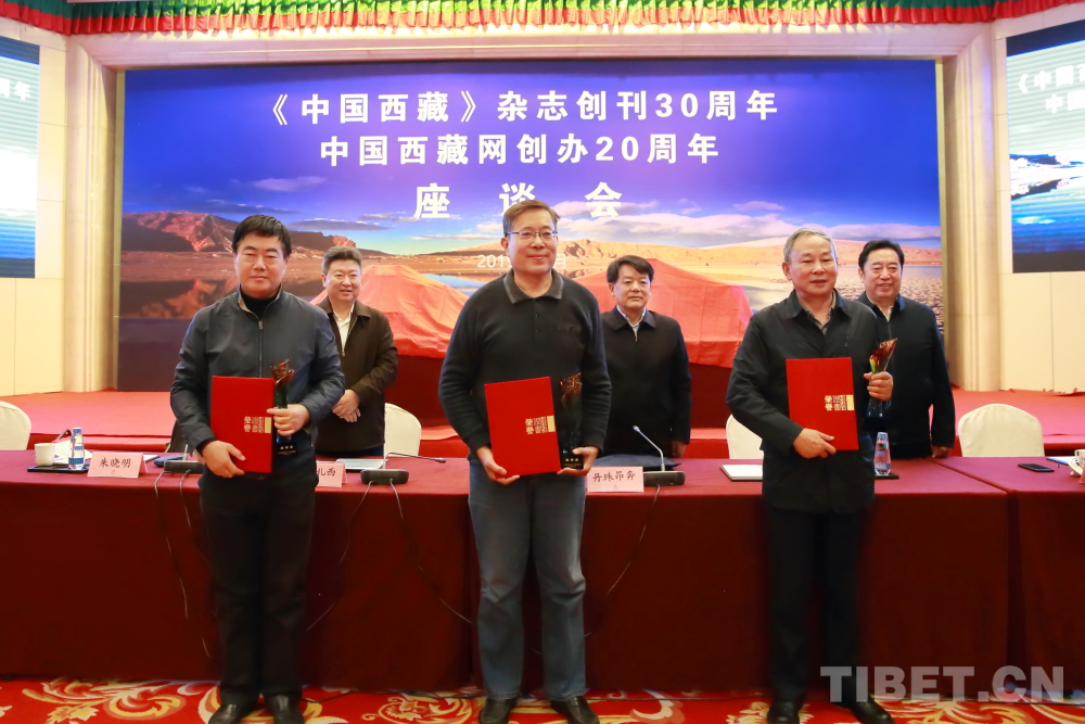圖為全國人大民族委員會副主任委員丹珠昂奔(后排中),青海省委常委、統(tǒng)戰(zhàn)部部長公保扎西(后排左)、四川省政協(xié)原副主席羅布江村(后排右)為中國西藏雜志社退休老領(lǐng)導(dǎo)頒發(fā)榮譽證書