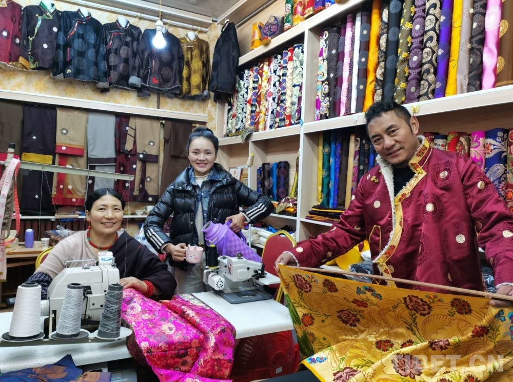 據(jù)介紹,他們的民族服飾產(chǎn)品服裝類,多是由旦周措毛裁剪、縫制。旦周措毛于2010年9月至2011年8月參加了由玉樹市扶貧口免費組織的農(nóng)牧民縫紉培訓班,后在家里經(jīng)過半年多時間的苦練,終于出師,可以獨自縫紉五種以上藏式服裝了。于是,他們兩口子在2013年11月注冊了公司、在結(jié)古大道拉布寺市場租下門面,經(jīng)營民族服裝。現(xiàn)在,旦周措毛是已是有9年經(jīng)驗的縫紉師了,只要用戶說出大致樣子,無論什么樣式她都能拿出令人滿意的成品。記者在鋪子里待了近一個小時,他們賣出了一件藏式襯衫和短羊皮襖。