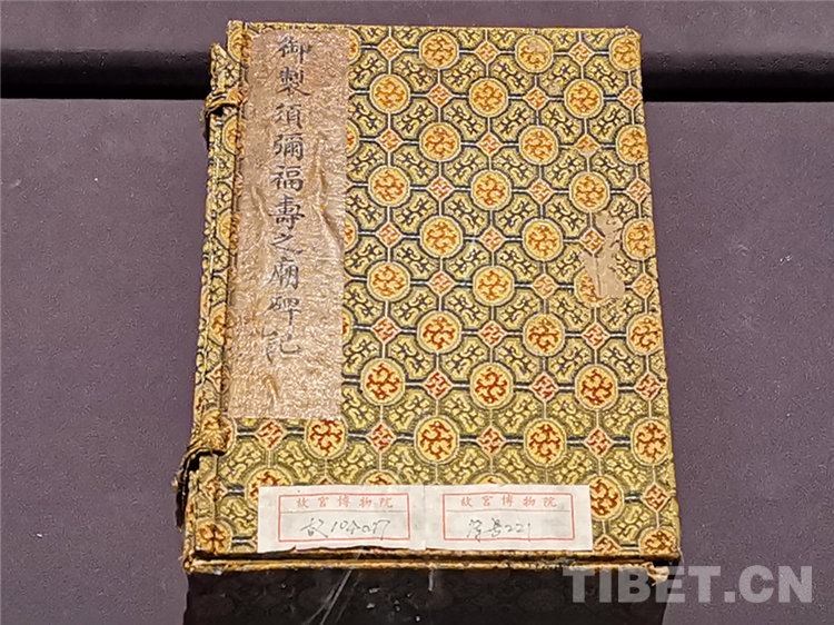 乾隆為迎接六世班禪的到來(lái),特于承德避暑山莊北面獅子溝南坡,仿日喀則扎什倫布寺,建造須彌福壽之廟供六世班禪講經(jīng)和居住。此書冊(cè)記錄了這一歷史。書冊(cè)經(jīng)折裝,上下面板裱織錦,全冊(cè)選用磁青紙以金汁書寫。扉頁(yè)、拖尾頁(yè)分別繪釋迦牟尼佛及韋陀,畫風(fēng)為典型乾隆宮廷風(fēng)格。正文以纏枝花卉紋為框,烏絲欄,一開(kāi)十行。