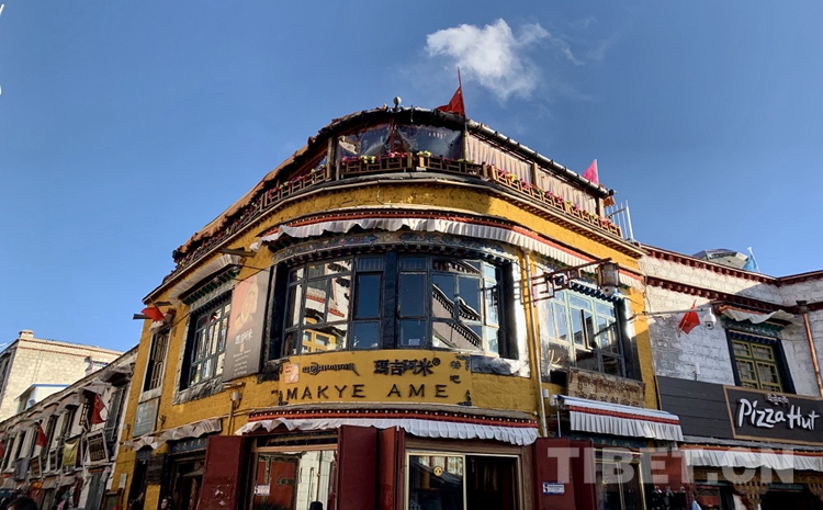 仔細(xì)觀察就會(huì)發(fā)現(xiàn),八廓街的建筑群里很少有大窗戶的房子,偶爾出現(xiàn)一兩棟,那必是有身份的大戶人家了。在舊時(shí),普通百姓家的房子都被統(tǒng)一成四方型的屋體,小小的窗戶,白色外墻,不允許有其他形狀、顏色或是出奇的設(shè)計(jì)。而就在八廓街的東南角有一棟暗黃色圓角的兩層小樓異常醒目,這當(dāng)然不會(huì)是一座普通的房子了,據(jù)說(shuō)這里曾是六世達(dá)賴?yán)飩}(cāng)央嘉措常常秘密造訪的地方。他曾在此地寫下了著名的情詩(shī)《在那東方的山頂上》,“在那東方高高的山頂上,升起一輪皎潔的月亮,未嫁嬌娘的面容,時(shí)時(shí)浮現(xiàn)在我的眼前”?!拔醇迡赡铩钡牟卣Z(yǔ)是“瑪吉阿米”,現(xiàn)在這里是一家叫做“瑪吉阿米”的藏餐吧。