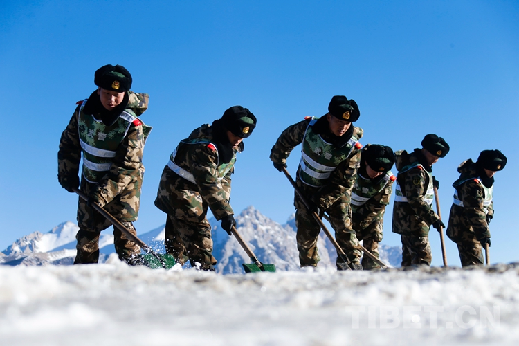 圖為官兵在川藏線然烏湖段清理路面積雪結(jié)冰