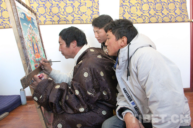 直到今天,父親雖然已經(jīng)離開人世很多年了,曲扎依然堅持子承父業(yè),手握畫筆,在偏遠的山坳里為寺廟、信教群眾繪制唐卡、壁畫。曲扎的3個兒子桑昂然珠(18歲)、土丁格來(14歲)、桑丁特秋(9歲)都在家里跟隨他學習勉唐畫派技藝,在祖孫四代的不懈努力下,古老的勉唐畫派在類烏齊縣境內(nèi)得以代代相傳。