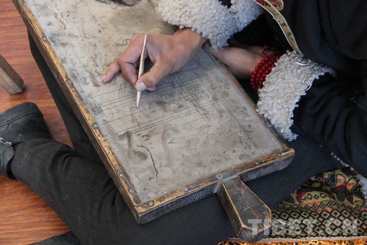 圖為桑昂然珠在木板上練習繪畫技法。這種木板上面先涂上墨水,再涂一層牛油,最后涂上牛糞燒成的灰,用削尖的木棍繪畫,畫過的痕跡可以擦掉反復使用 攝影:李元梅