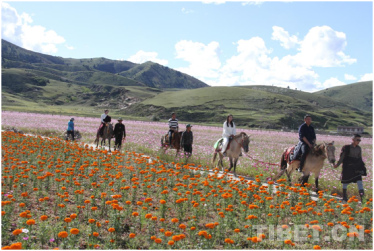 從理塘縣前往稻城亞丁機(jī)場(chǎng)方向60多公里,翻過(guò)一座小山坡,一片如夢(mèng)似幻的花海景觀瞬間映入眼簾。曾經(jīng)名不見(jiàn)經(jīng)傳的小山村——濯桑鄉(xiāng)漢戈村已實(shí)現(xiàn)“沙化地”到“花?!钡耐懽儯蔀樾碌木W(wǎng)紅打卡點(diǎn)。在花團(tuán)錦簇間拍照、在草原上騎馬,或者到旁邊康藏陽(yáng)光種植基地采摘“極地果蔬”、購(gòu)買農(nóng)民合作社的原生態(tài)農(nóng)副產(chǎn)品……游客可盡興體驗(yàn)。
