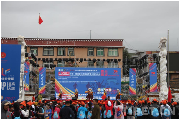 資料圖:在中國(guó)?理塘壹占高城越野賽半程馬拉松啟動(dòng)儀式上,藏戲?yàn)榛顒?dòng)熱身