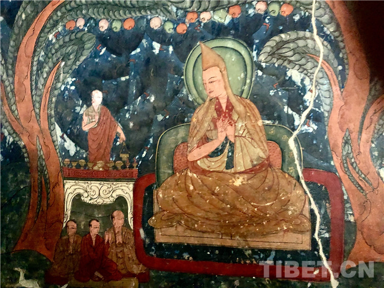 自從朗達(dá)瑪滅佛以來,佛教在吐蕃遭到了致命的打擊,一些僧人避難至遙遠(yuǎn)的阿里,保存了佛教的火種,并且開啟了藏傳佛教的后弘期。托林寺雖遠(yuǎn)在西藏邊緣一隅,卻在藏傳佛教后弘期扮演了重要的角色。11世紀(jì),受阿里地區(qū)的統(tǒng)治者絳曲沃和大譯師仁欽桑布之請,阿底峽由納措催成杰瓦、俄列貝希繞、甲尊僧格等五人到印度迎請來到托林寺,駐寺三年,幫助校譯佛經(jīng)。后又至衛(wèi)藏、拉薩等地譯經(jīng),成為西藏復(fù)興佛教的一位重要人物。關(guān)于這一段歷史的表述,托林寺壁畫中有這樣一幅小圖。圖右邊戴帽者為主佛阿底峽尊者,阿底峽為古印度僧人、佛學(xué)家,聲名極盛。左上角站立者是拉喇嘛絳曲沃,左下三人分別為:譯師納措催成杰瓦、俄列貝希繞、甲尊僧格。