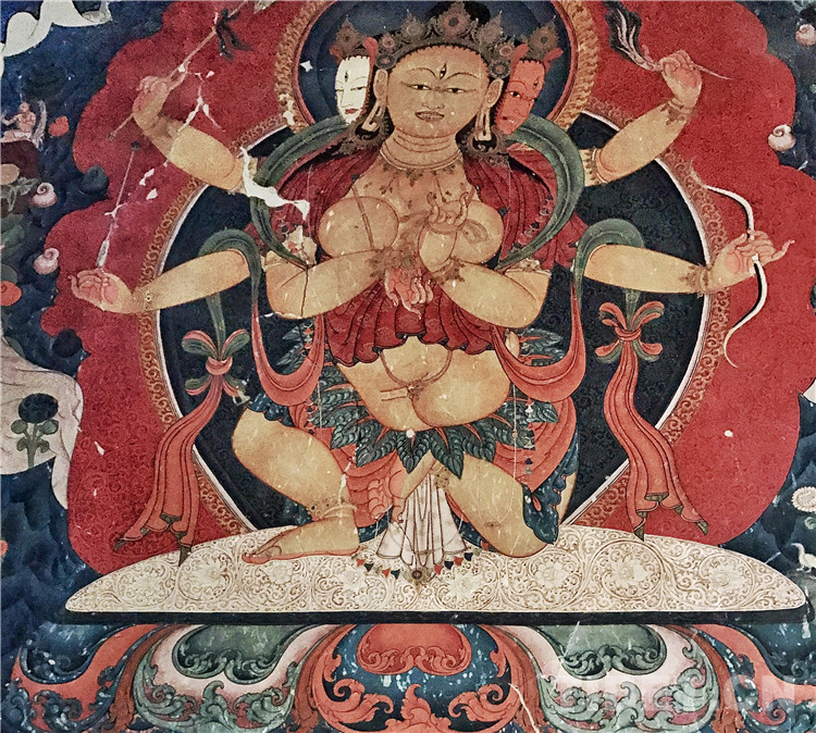 葉衣佛母的識別標(biāo)志是其身著以樹葉編織的衣裙,左上手持藥枝,其他五臂則持不同法器。葉衣佛母在藏傳佛教中是主管疾病醫(yī)藥的神。三頭六臂九眼,上身坦露,身軀呈現(xiàn)半蹲立姿態(tài),本件作品之風(fēng)格可以見到15世紀(jì)上半葉江孜風(fēng)格在古格繪畫的運(yùn)用:包含以紅色,綠色,藍(lán)色為主的色調(diào);源于尼泊爾的淚滴狀頭冠形式;肩上飄逸的衣帶與衣著上的織繡圖案等。同時,背景中以暈染的深淺來呈現(xiàn)凌厲的巖石,以及呈卷狀拖曳的祥云圖飾,則是使用了漢地美學(xué)的元素。