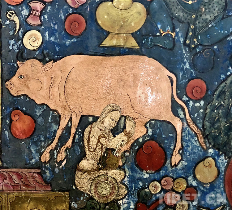 對于世俗生活的紀(jì)實(shí)性記錄,是古格時期壁畫的一大貢獻(xiàn)。生活場景、器物大量出現(xiàn)在托林寺壁畫中,圖中擠奶女子的神情很專注,牛也安靜得好似在享受。乳汁從女子兩肘之間流入她身前的罐子里。人和動物的比例都很精準(zhǔn),在大面積深色的背景上,畫家選用了淺色來描繪這個畫面,使得這微小的細(xì)節(jié)非常醒目。牧業(yè)一直是阿里地區(qū)的主要產(chǎn)業(yè),擠奶、制作奶制品是當(dāng)?shù)孛课徊刈鍕D女都會的家務(wù)。在自由創(chuàng)作的區(qū)域,壁畫創(chuàng)作者很自然地將這日常勞作描繪出來。但是,女子的服飾是印度風(fēng)格,牛也不是青藏高原特有的牦牛,說明了當(dāng)時古格藝術(shù)對外域文化的開放性。
