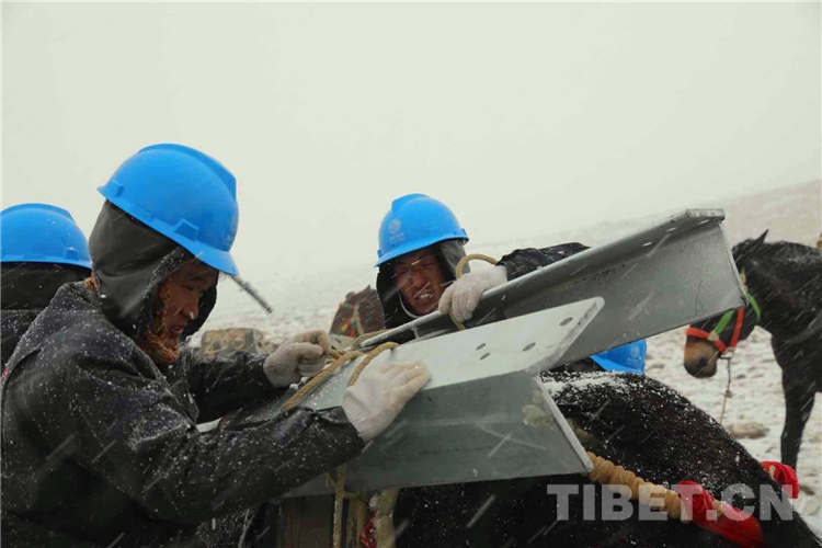加上山脊上都是尖石頭,馬蹄子上粘了雪,走路也開始變滑。眼看著不遠(yuǎn)的運(yùn)輸距離,其他塔位半個(gè)小時(shí)能運(yùn)輸一趟,在風(fēng)雪里,又在5357米海拔高的地方,變成了一個(gè)半小時(shí)一趟。此時(shí)4R053號(hào)塔位氣溫已經(jīng)降到零下25度,風(fēng)速已經(jīng)達(dá)到8級(jí),人在風(fēng)雪里已經(jīng)站不住了,更不要說是負(fù)重的馬匹?!靶值軅円а缊?jiān)持住,這一趟運(yùn)輸必須完成,呆久了馬兒要受不了了,馱完這一趟,我們就往山下撤?!鄙辰鹑A在風(fēng)雪里大聲地吼道。