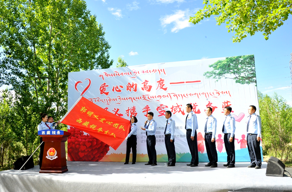 接過“郭明義愛心團隊西藏稅務(wù)分隊”的大旗,一組青年稅務(wù)干部登臺宣誓。稅務(wù)干部次仁頓珠說,加入郭明義愛心團隊既光榮,又是一份沉甸甸的責(zé)任,要將這份愛心傳承好、發(fā)揚好,用心、用情投入公益事業(yè),在決戰(zhàn)脫貧攻堅、決勝全面小康的舞臺上展示稅務(wù)藍、貢獻稅務(wù)力量。