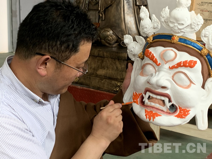 圖為畫師正在為藏式面具上色