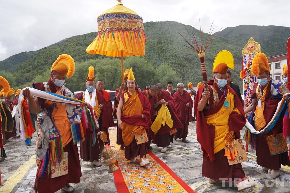 同樣期盼著十一世班禪到來的還有巴青縣苯教寺院巴倉(cāng)寺央旦桑布等眾僧。8月22日,十一世班禪參訪巴倉(cāng)寺了解寺院歷史文化,登上杜康殿寶座并為僧眾摸頂。