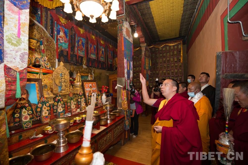 在溪水環(huán)抱的達孜寺,十一世班禪先后進入杜康殿、度母殿、護法神殿禮佛,隨后在杜康殿為僧眾摸頂賜福,傳授《隨許皈依經(jīng)》和《菩提道矩論》。寺廟僧眾向十一世班禪敬獻曼扎。