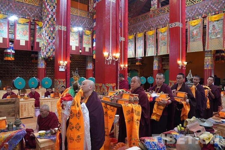8月30日,在云霧縹緲、稻谷飄香中,十一世班禪經(jīng)曲折蜿蜒的盤山路前往仁青崩寺禮佛。在寺廟僧人的迎接下,十一世班禪前往杜康殿,隨后十一世班禪登上杜康殿寶座,僧眾集體誦經(jīng)祈福,心誠(chéng)意敬、虔誠(chéng)跪拜,寺院僧人向十一世班禪敬獻(xiàn)曼扎。十一世班禪為僧眾摸頂賜福、賜贈(zèng)金剛結(jié)及法相照片、發(fā)放布施。