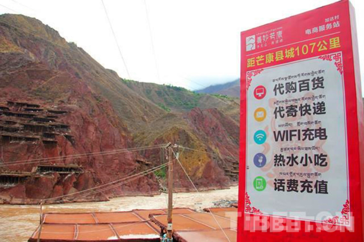 圖為千年古鹽田邊的芒康縣農(nóng)村電商服務站廣告牌。 攝影:李元梅