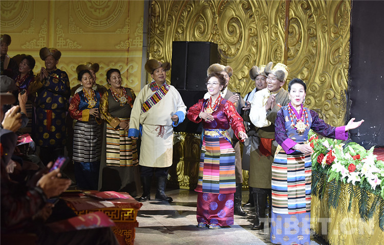 圖為紀(jì)念西藏自治區(qū)藏劇團(tuán)成立60周年藏戲?qū)鲆魳窌洗笱虢穑ㄓ乙唬┑人囆g(shù)家登臺亮相,接受青年演員的致敬 攝影:王媛媛
