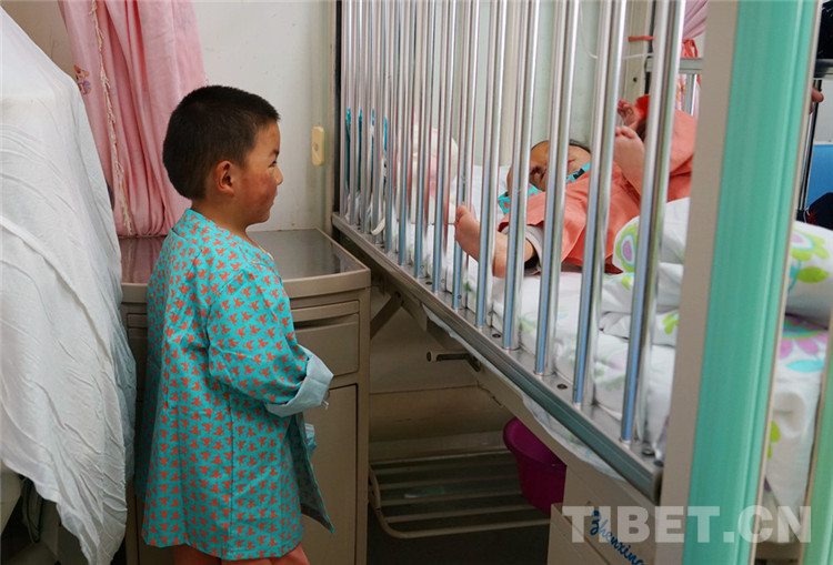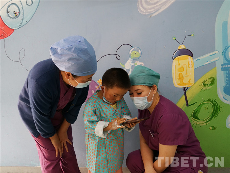 在記者采訪過程中,呷瑪龍刀尼瑪閑不住地跑來跑去,一會兒跑去看病友妹妹呷絨拉姆有沒有乖乖睡覺,一會兒又拿起舅舅的手機刷小視頻,還熱情地分享給護士看。