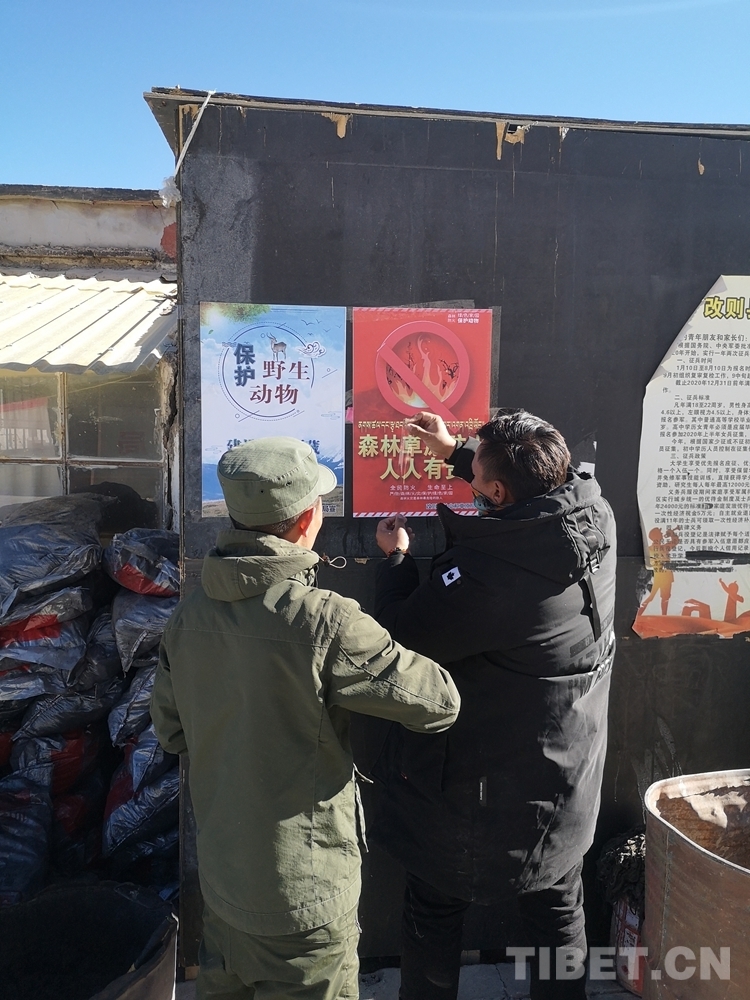 圖為改則縣林業(yè)和草原局巡護(hù)人員粘貼宣傳海報(bào)