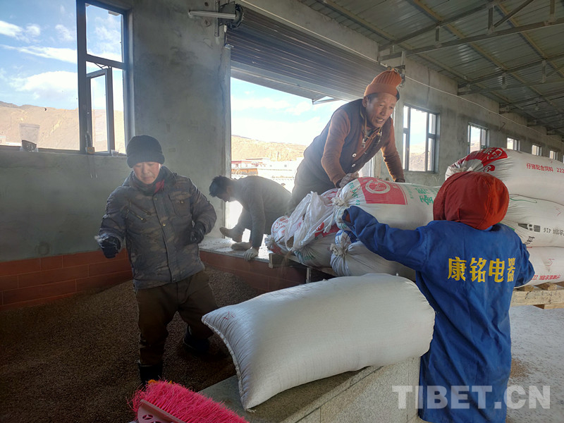 在該園的格薩甲波糧倉現場,裝滿糧食的拖拉機和貨車,有的忙著把青稞卸下來,有的忙著把青稞倒進糧食精選機里、有的忙著稱重、有的忙著做登記,忙得不可開交。