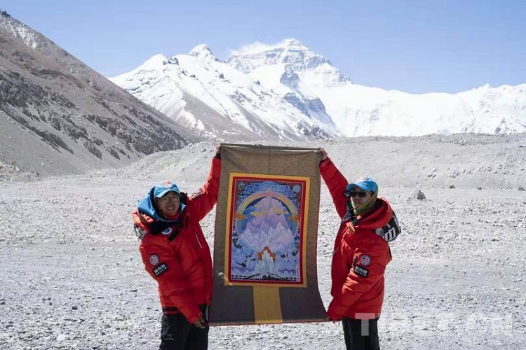 圖為2020年5月中國珠峰高程測量登山隊手持《珠峰疊彩》新唐卡在珠峰腳下合影