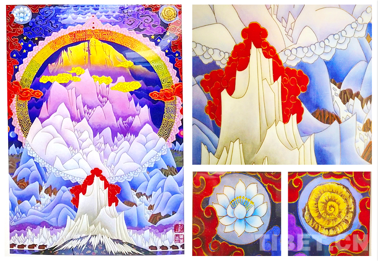 而令葉星生深受觸動的,是十世班禪大師對創(chuàng)作的關心、前衛(wèi)的創(chuàng)作思路和嚴格的要求?!笆腊喽U大師多次提出指導意見,鼓勵我們大膽創(chuàng)新,要融入光影等繪畫新技法及漢族傳統(tǒng)繪畫技法,使珠峰更有立體感,使畫作成為現(xiàn)代藝術技法與藏族傳統(tǒng)繪畫手法相融合的代表,成為民族團結的象征。所以,這幅畫在結構上參考了唐卡,比如彩虹;祥云、太陽、月亮、星斗對稱的方式等來自西藏傳統(tǒng)壁畫藝術;但在光線、明暗對比等方面加入了漢地工筆重彩,甚至西方的藝術手法。在天地之間以更加立體的視角展現(xiàn)出了珠峰壯麗雄偉的全景?!?/p>