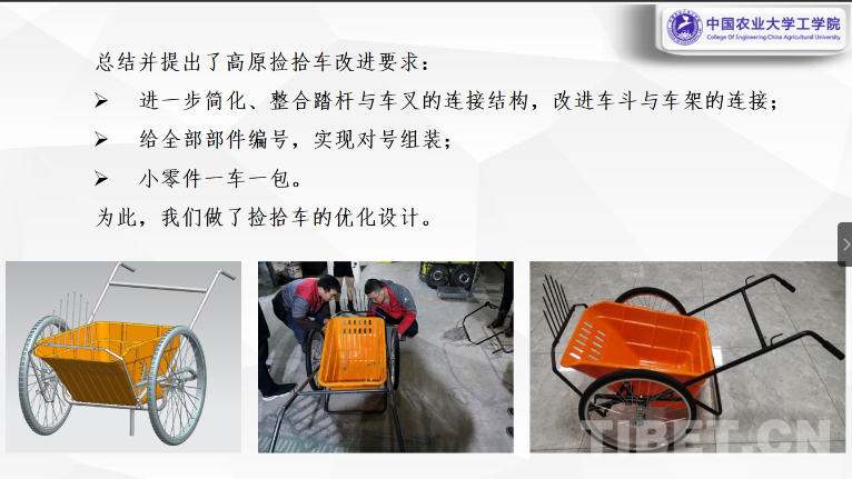 啟動會上,高原撿拾車研發(fā)首席專家中國農(nóng)業(yè)大學工學院教授王光輝介紹了高原撿拾車最新改版的情況。他表示,針對過去推廣中發(fā)現(xiàn)的個別問題,對車子進行了優(yōu)化設計,去掉了易發(fā)生損壞的控叉線閘,調整了車身的踏桿與車叉的連接結構,改進車斗與車架的連接,做到了對號組裝和小零件一車一包等,使安裝更加便捷、使用更加方便、車子更加堅固。