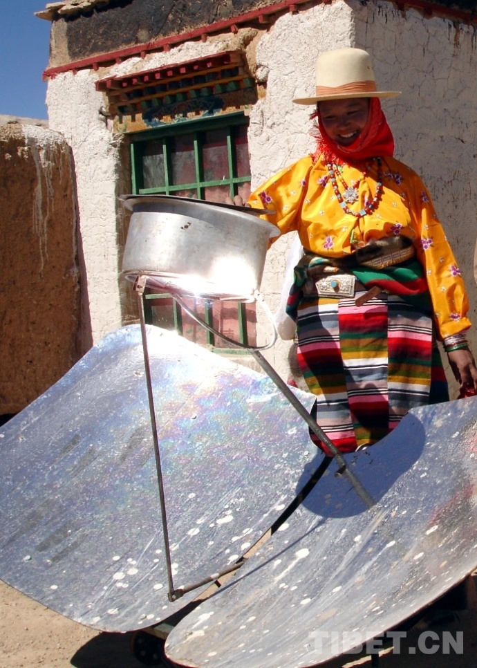 在藏北高原,現(xiàn)在隨處可見城鎮(zhèn)里的一個個太陽能路燈、一棟棟太陽能采暖樓和采暖房,一排排房頂上斜立著的太陽能熱水器,就連牧民家也常??梢钥吹桨卜旁诖扒?、屋頂和院內的電池板、太陽灶。利用太陽能燒水做飯和發(fā)電照明,既方便又干凈,老天爺還不收燃料費。