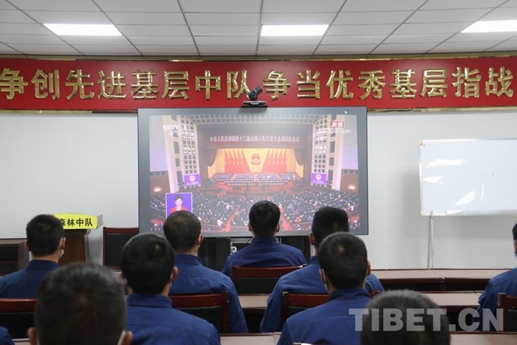 圖為昌都市左貢縣森林消防中隊隊員收看全國兩會直播