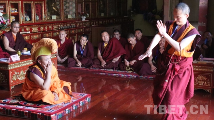 進入考場后,學僧和辯經(jīng)人員分兩排盤腿相對而坐,評委就坐于考場正上方。集體誦經(jīng)后,評委根據(jù)名單,依次讓學僧和辯經(jīng)人員出列進行辯經(jīng)。這時參加考評的學僧盤腿就坐于考場正中央,伴著兩掌相擊發(fā)出清脆的聲音,辯經(jīng)人員圍繞著學僧,不斷提出問題,言辭激烈,答辯者則不僅要口若懸河,更需要沉著應(yīng)對。