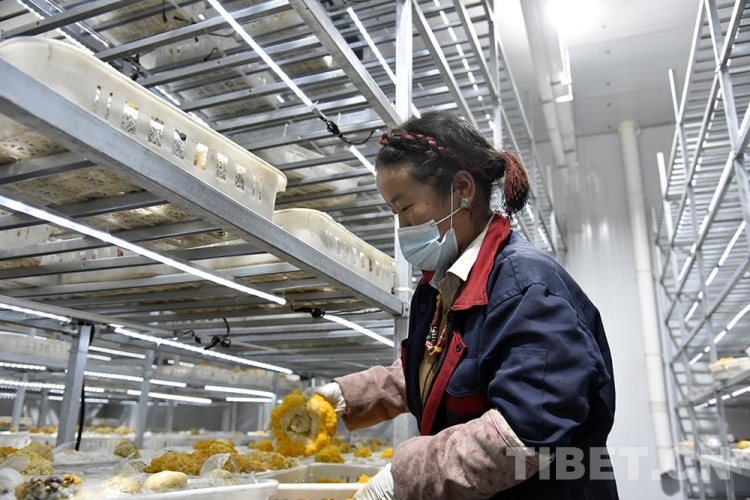 圖為2020年8月拍攝的日喀則市珠峰一見則喜生物科技示范園區(qū)出菇棚里工人正在采摘金耳 攝影:王媛媛